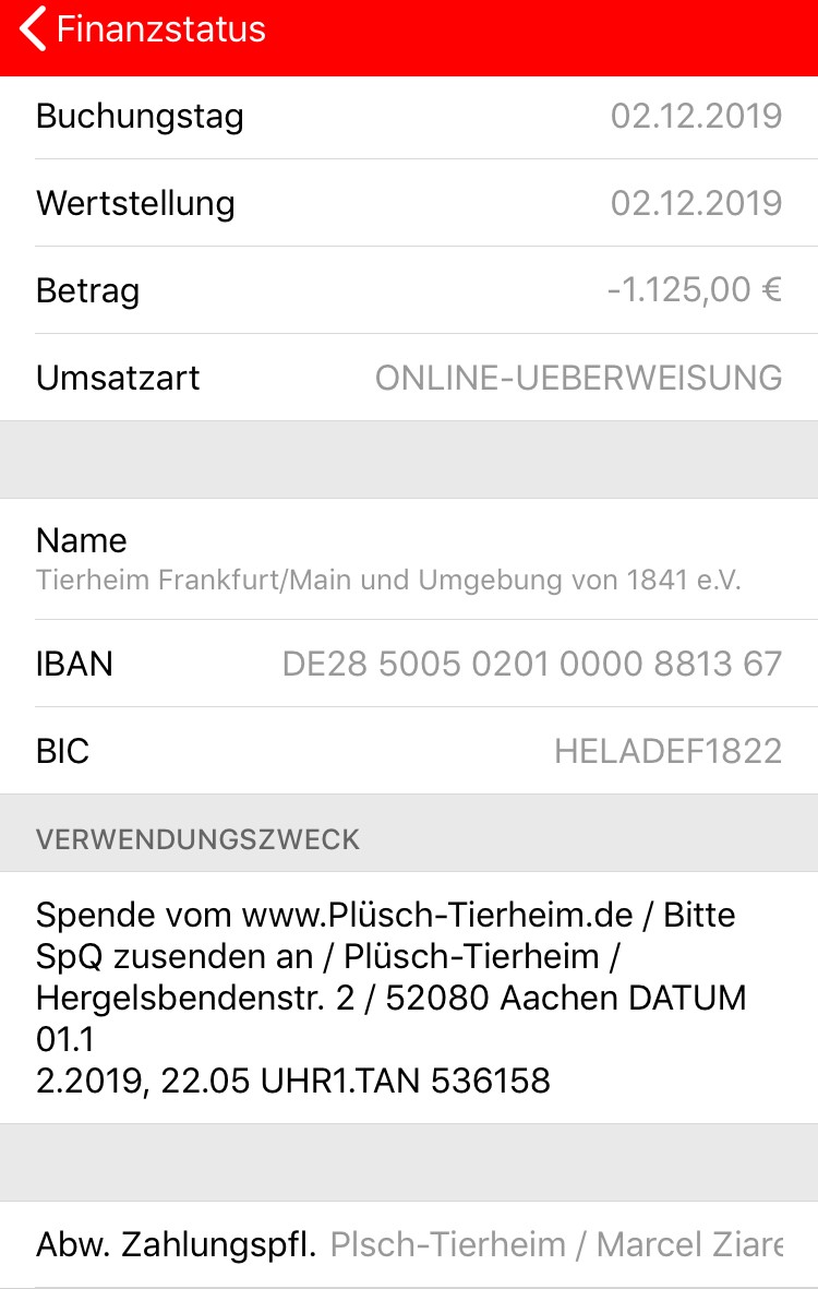 SPENDE: Liebe Fans wir haben 1125€ an das Frankfurter Tierheim gespendet. Unser Onlineshop www.Pluesch-Tierheim.de hat gemeinsam mit euch in so kurzer Zeit und trotz der Kosten wie: Steuern, Lagerräume, Reinigung, Verpackungsmaterial, Homepage, Sprit, Arbeitszeit, Strom, PayPal Gebühren, Bank Gebühren, Werbematerial und dem enormen Zeitaufwand für Telefonate, Verpacken, Beschreiben, Fotografieren, Wiegen, Messen usw. geschafft diesen Betrag zu spenden. Danke für all die lieben Plüschtier-Adoptiveltern, Danke für alle Plüschtier-Spender, Danke an alle Kinder die aussortiert haben, Danke für jedes like, Danke das es euch gibt, Danke an alle Freunde und Fans. Unsere Deutschland Spendentour zieht weiter und sammelt ab jetzt für das Tierheim in G wie Gelsenkirchen. Weitere Infos folgen. Gemeinsam schaffen wir was großes.