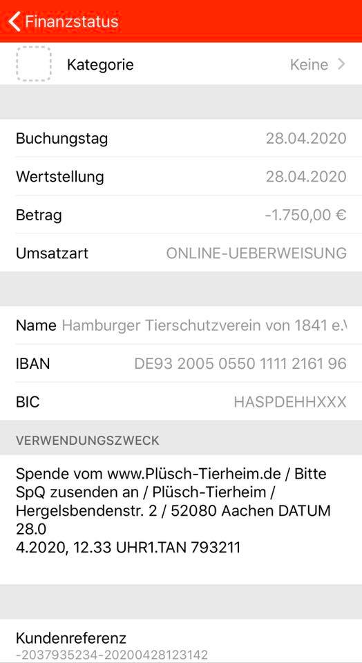 1750€ GESPENDET: Liebe Fans wir haben heute 1750€ an den Hamburger Tierschutzverein gespendet. Unser Onlineshop www.Pluesch-Tierheim.de hat gemeinsam mit euch in so kurzer Zeit und trotz der Kosten wie: Steuern, Steuerberater, Lagerräume, Reinigung, Verpackungsmaterial, Homepage, Sprit, Arbeitszeit, Strom, PayPal Gebühren, Bank Gebühren, Werbematerial, Mitarbeiter und dem enormen Zeitaufwand für Telefonate, Verpacken, Beschreiben, Fotografieren, Wiegen, Messen, Preise recherchieren usw. geschafft diesen Betrag zu spenden. Allein dieses Jahr haben wir somit schon über 3100€ deutschen Tierheimen gespendet. Danke für all die lieben Plüschtier-Adoptiveltern, Danke für alle Plüschtier-Spender, Danke an alle Kinder die aussortiert haben, Danke für jedes like, Danke an alle Freunde und Fans, Danke für jede Bewertung, Danke das es euch gibt. Unsere Deutschland Spendentour zieht weiter und sammelt ab jetzt für das Tierheim in I wie Ingolstadt. Weitere Infos folgen. Gemeinsam schaffen wir was großes.