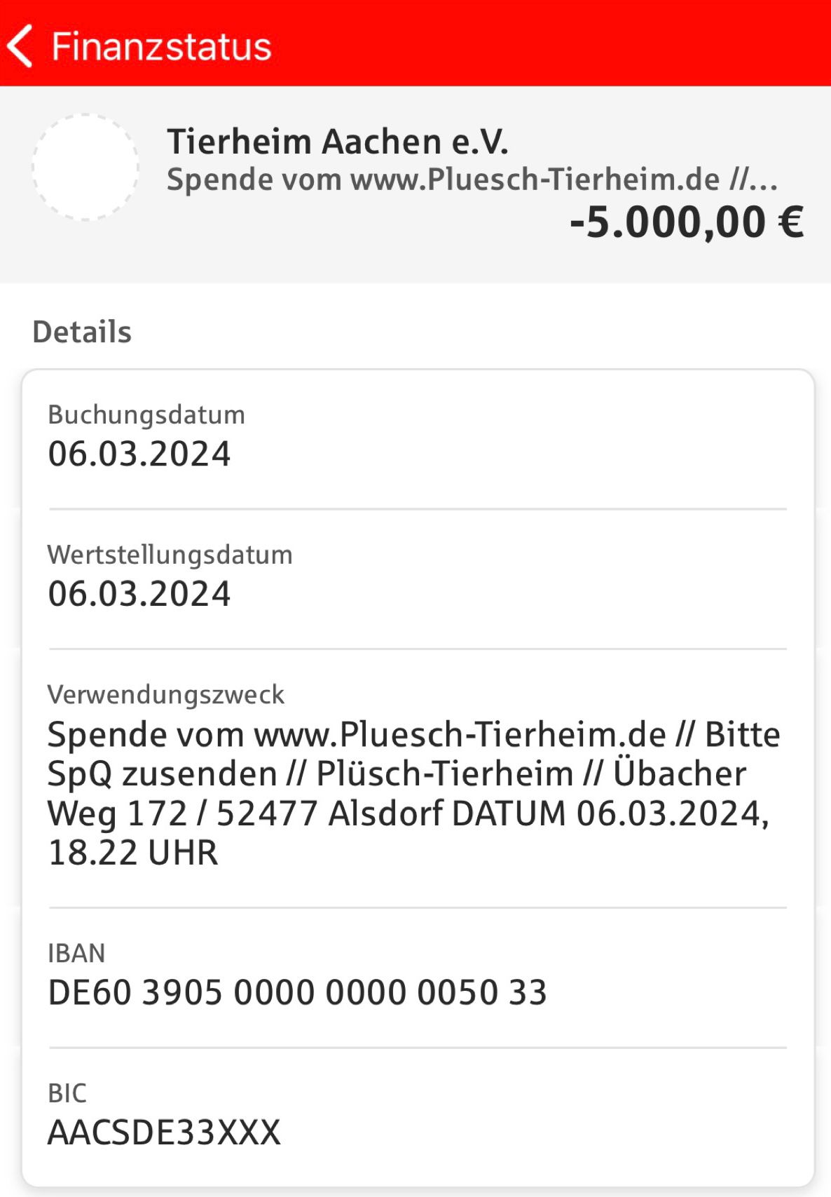 KNAPP 75.000€: Mega, wir haben gerade Gemeinsam dem Tierschutzverein in A wie Aachen 5000€ gespendet.
